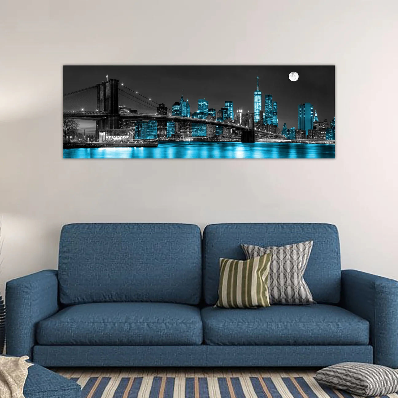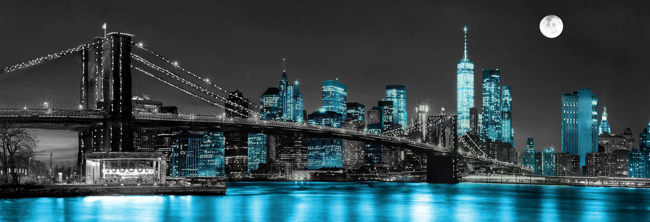 Experience the iconic beauty of New York City with our Brooklyn Bridge Glass Wall Art. Measuring 70"X24", this stunning piece showcases the famous bridge adorned with blue, grey and crystal accents. Elevate your home decor with this elegant and timeless addition.