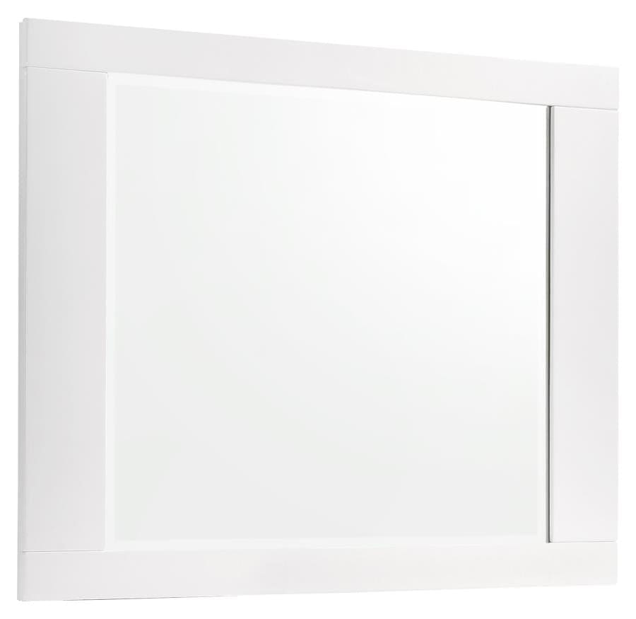 | For a contemporary home with modern furnishings, this 5-piece bedroom set from the Felicity collection is just the set you need for the master bedroom. The clean, crisp bed is built with a low-profile footboard and headboard, which features futuristic blue LED touch lighting for convenience that illuminates. The nightstand, chest, and dresser each have deep drawers with metal handles finished in a lustrous polished chrome as well as top drawers that are felt-lined for protection. The matching rectangular mirror goes easily atop the dresser to complete the set. Each piece is masterfully finished with a brilliant white polyurethane coat eye-catchingly polished to a high-gloss finish. |