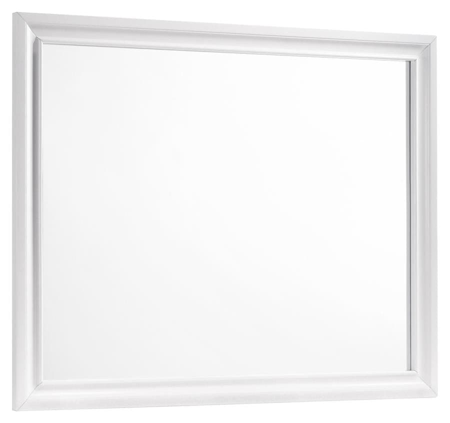 | Exceptionally designed for transitional bedrooms, this five-piece bedroom set includes a panel bed frame, single two-drawer nightstand, five-drawer chest, and seven-drawer dresser with mirror, all in a crisp white finish with shiny metal hardware with faceted crystal accents. The paneled headboard and footboard offer channel tufted paneling wrapped in a metallic leatherette upholstery. Other extra touches include frame molding, turned feet, and felt lined top drawers. The nightstand offers a convenient power outlet for charging devices before bed. Place this bedroom set in a home to lend a more glamorous vibe. |