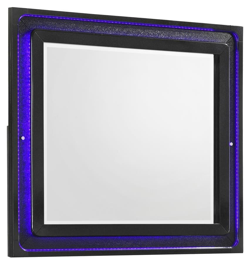 * Contemporary glam design with argyle pattern and an upholstered headboard * Acrylic bling knobs compliment the midnight star leatherette upholstery that is easy to maintain * Stingray embossed drawer fronts * Headboard and mirror feature blue LED touch lighting for ambiance * Metal ball bearing extension glides create stability and smooth operation * Exclusive to Coaster |