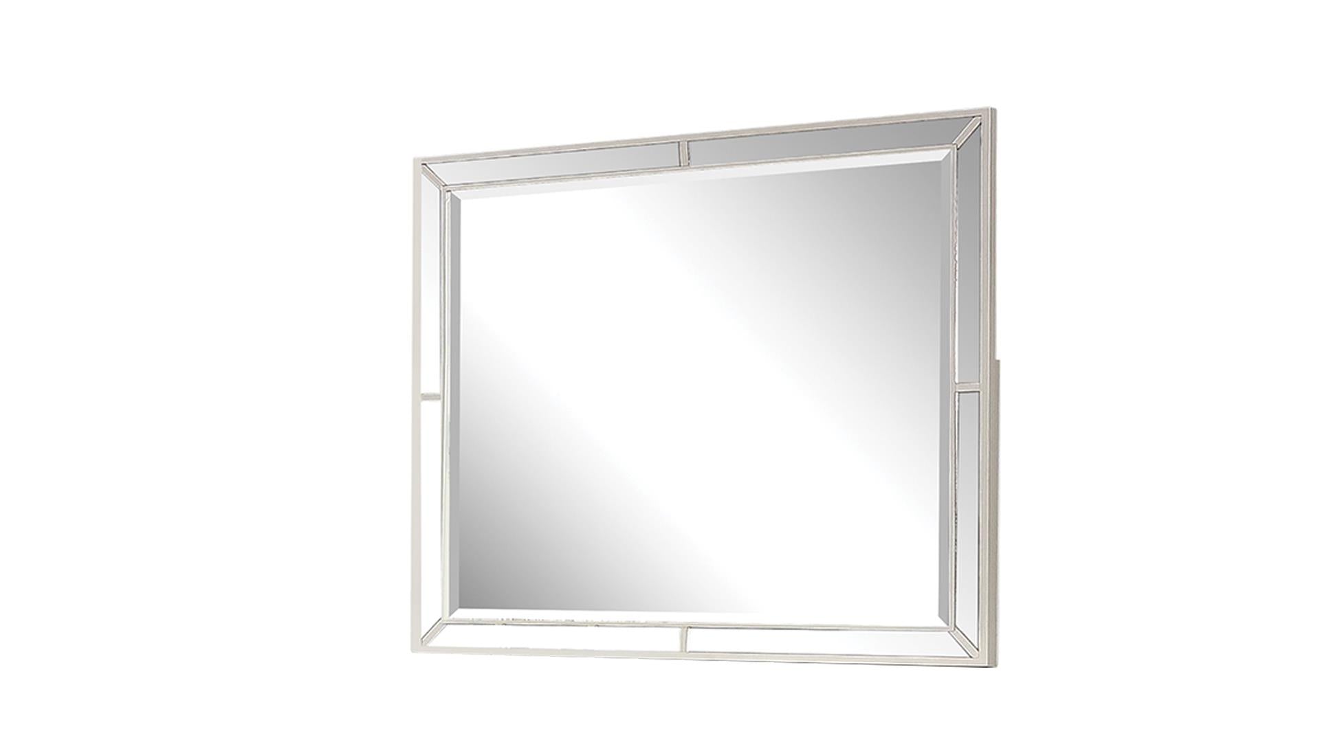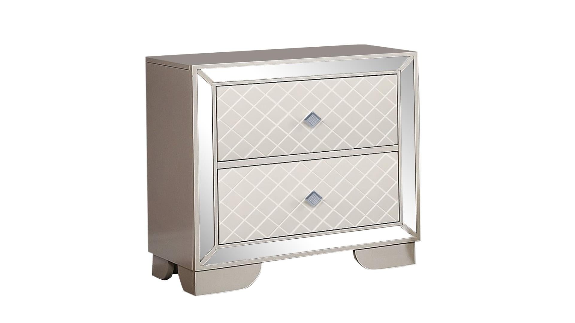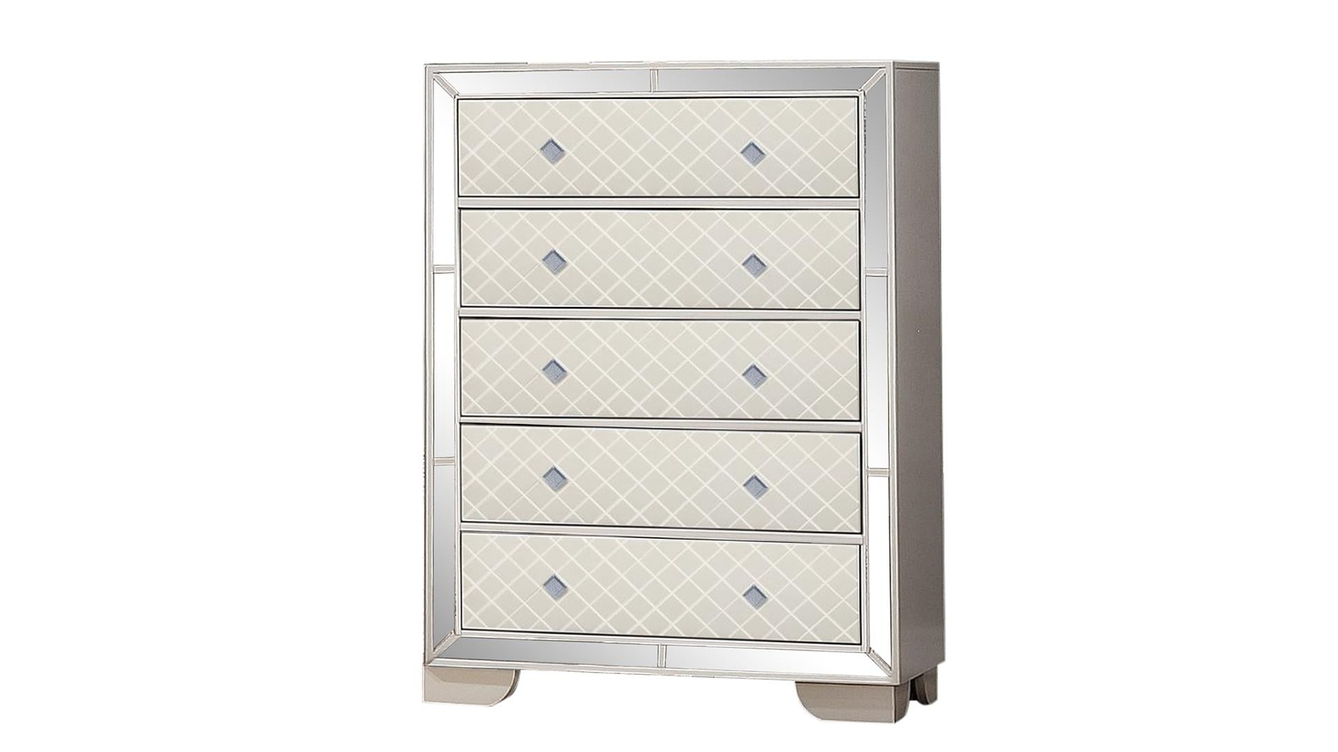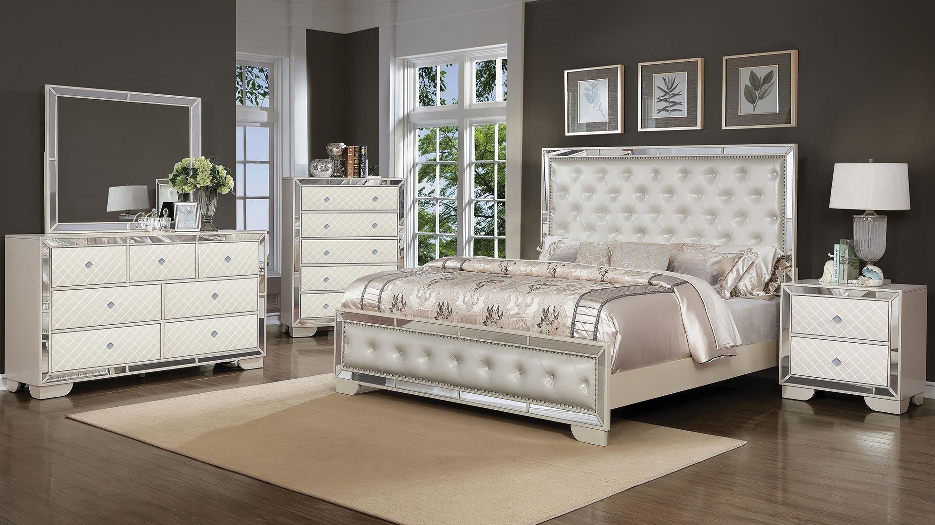 Contemporary bedroom set, embossed design on all case fronts with diamond accent hardware. Tufted HeadBoard. Full extension drawers with top drawer felt lined. The bedroom set comes in the elegant Park Beige finish