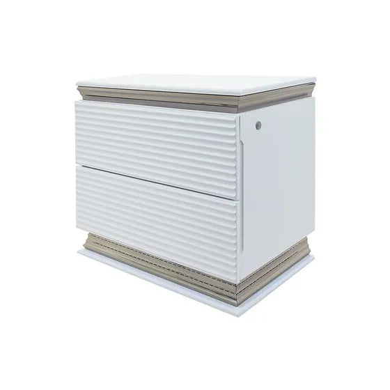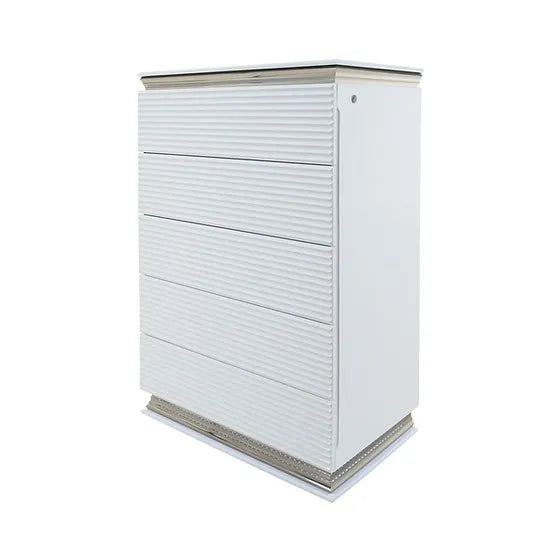 • The Dalal Bedroom Set has everything you need to bring a new design to your bedroom. Each piece is made of glossy white wood and chrome metal accents with LED lighting, so you can add a stunning modern bedroom set to your home. For your storage needs, the dresser comes with six  drawers that extend, giving you plenty of room for your clothes and jewelry. The nightstand includes two drawers which are perfect for your charging cords, books, and more.