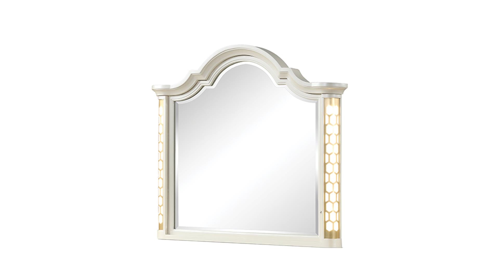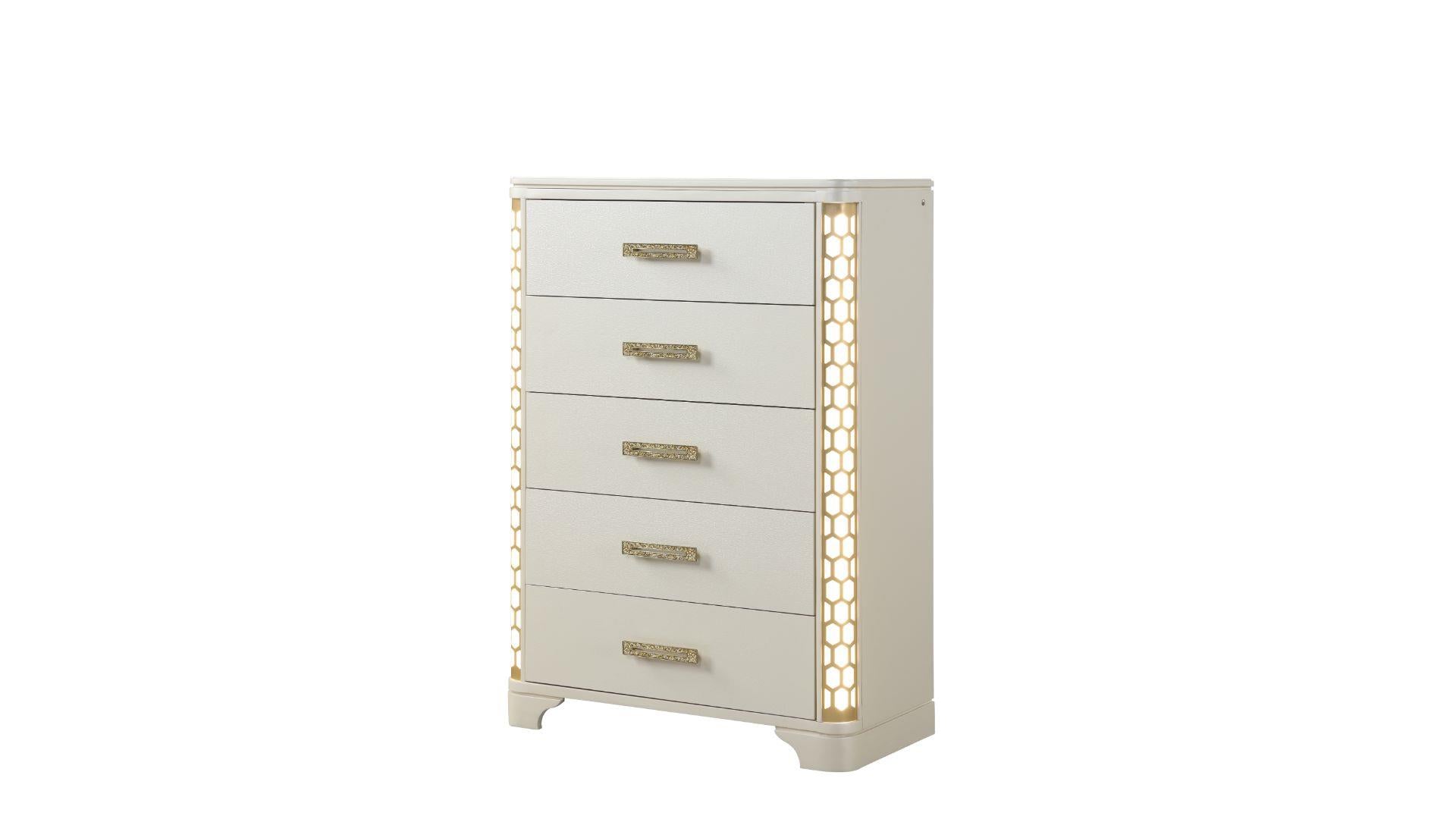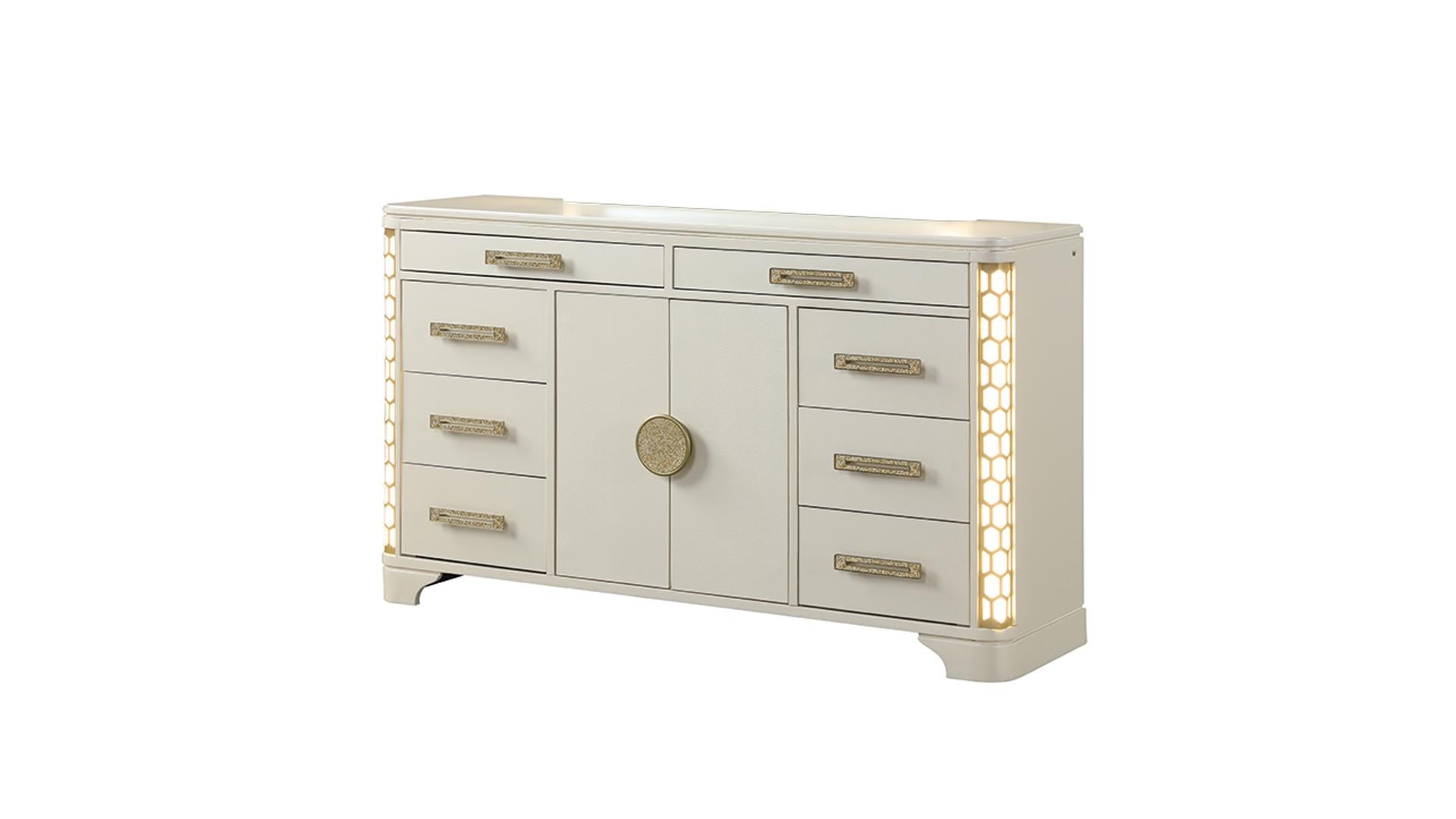 Traditional Old-World European styling elements are blended to create a romantic look in this Bedroom Collection. The heavily framed upholstered headboard features champagne-tone with crystal button tufting. This collection is crafted and inspired by the luxurious designs of the past, expertly detailed with a modern touch of LED lights. In the center of the headboard and footboard lies minimalistic geometric work that marks the space and renders it harmonious and elegant. This Beige color luxurious Bedroom set is perfect for those who want contemporary opulence. This set includes one bed, one dresser, one mirror and one nightstand. Each piece is equipped with unique lights in the corner of each frame, creating an exceptional design offering unmistakable style and excellence. The case goods boast gold accent drawer pulls, enhancing the presentation. Drawers provide spacious storage for your stuff and other essentials, making this case goods a grand yet functional home companion. The Designer Luxury Bedroom Set is the epitome of pure elegance and a perfect bedroom set for the luxuriously traditional homeowner!