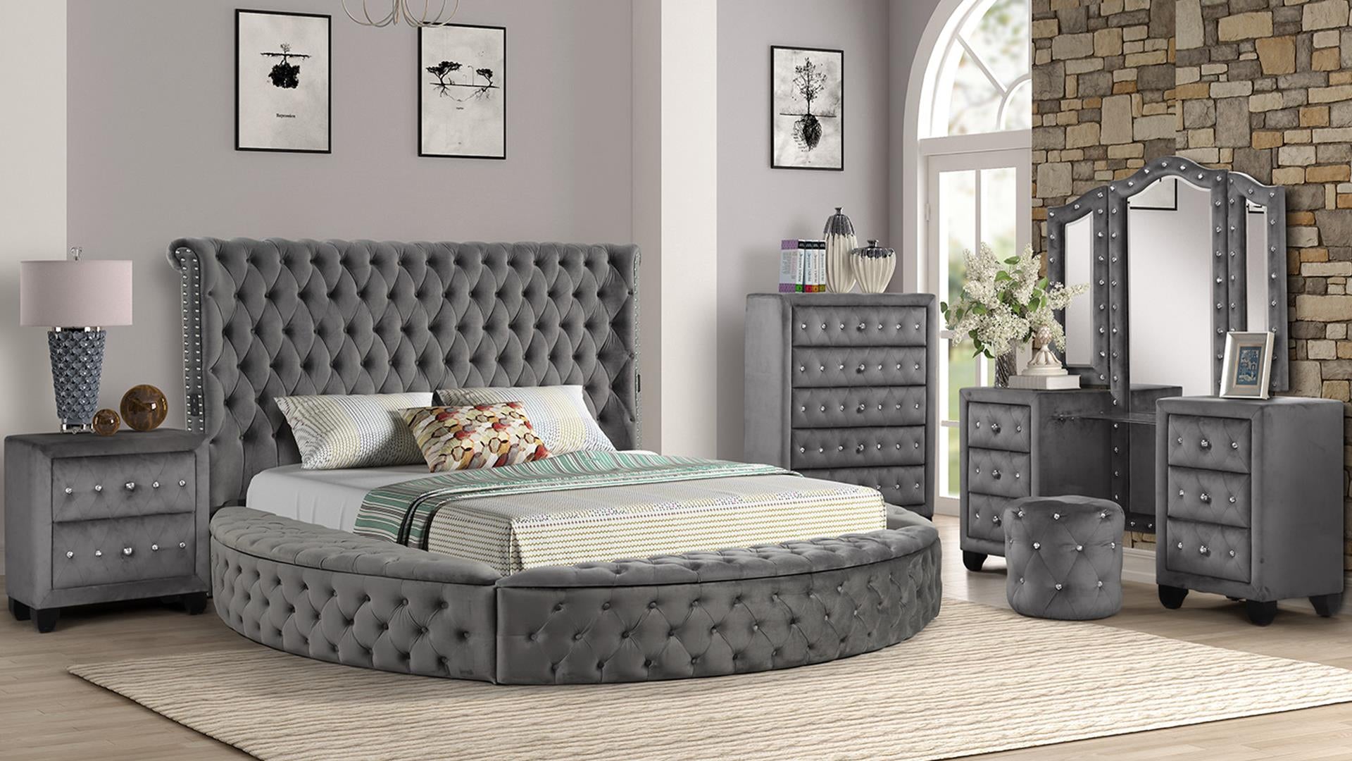 With its lavish movie-star contemporary design, this elegant bedroom set adds more excitement in to your bedroom decor. The bedroom set is tufted upholstered in velvet fabric headboard and footboard. Built on a solid wood frame with accents nail head application, added more beauty towards to the bed. Speakers on both sides of the headboard along with two USB ports in each side make this bedroom set more applicable. Upholstery color options: Navy, Black and Black. This stylish bedroom set includes; one bed, vanity set and one nightstand. Upholstery & Footboard with extra storage space, adds more utility value to the set by enhancing its glamor.
