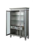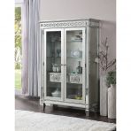 Curio Cabinet Storage: 2 Glass Front Doors (Inside: 5 Compartments with 3 Glass Shelves & Drawers) Wooden Frame, Raised Geometric Trim, Beveled-Mirror Inlay, Tapered Leg (Wood Side Panels; Wooden Back Panel) CONSTRUCTION] Wooden Frame: Beveled Mirror, Wood (Poplar+Rbw), MDF, Glass Mirrored Tapered Leg Drawer: GLIDE Side Metal, HARDWARE: Single Crystal-like Pull-Knob (Sunburst Molding) Q&A) Light Function NOT Included