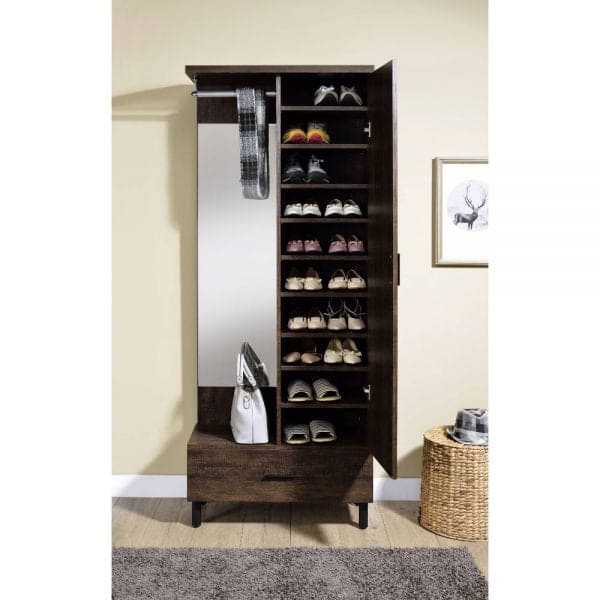 Rectangular Hall Tree Storage: Open Compartment with Mirrrored Back Panel & Hanging Rod, 1 Drw & 1 Doors (Inside 10 Compartments, 9 Wooden Shelves) Wooden Case Frame: Rustic Finish Metal Straight Leg
