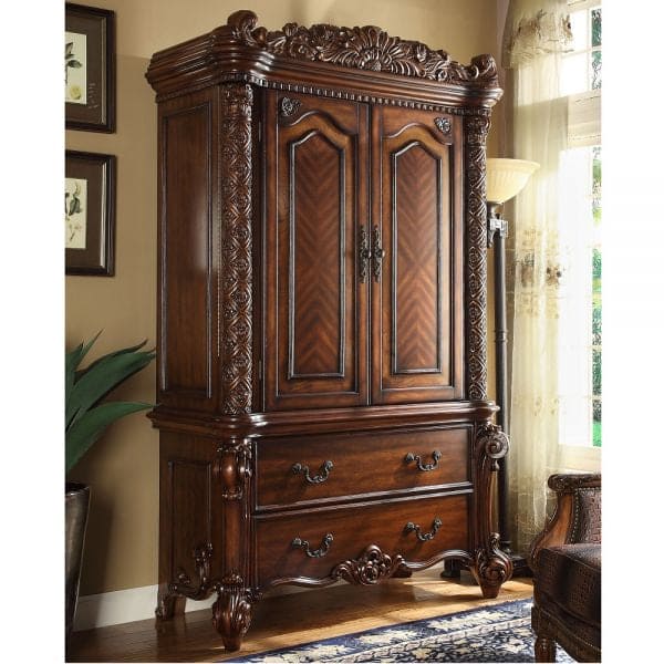 Create an elegant, traditional design in your bedroom with the cherry Vendome TV Armoire. This hand-crafted piece inspired from the luxurious designs of the past, this TV Armoire features elaborate wood carving details, traditional hardware and a sophisticated style.