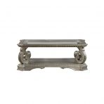 KD, Rectangular Coffee Table Storage: Open Compartment (Bottom Shelf) Top: Glass Insert CONSTRUCTION Wood Top w/Glass Insert Clear Tempered Glass w/Beveled Edge Wood Floral-Scrolled Leg & Base-Shelf: Poly-Resin