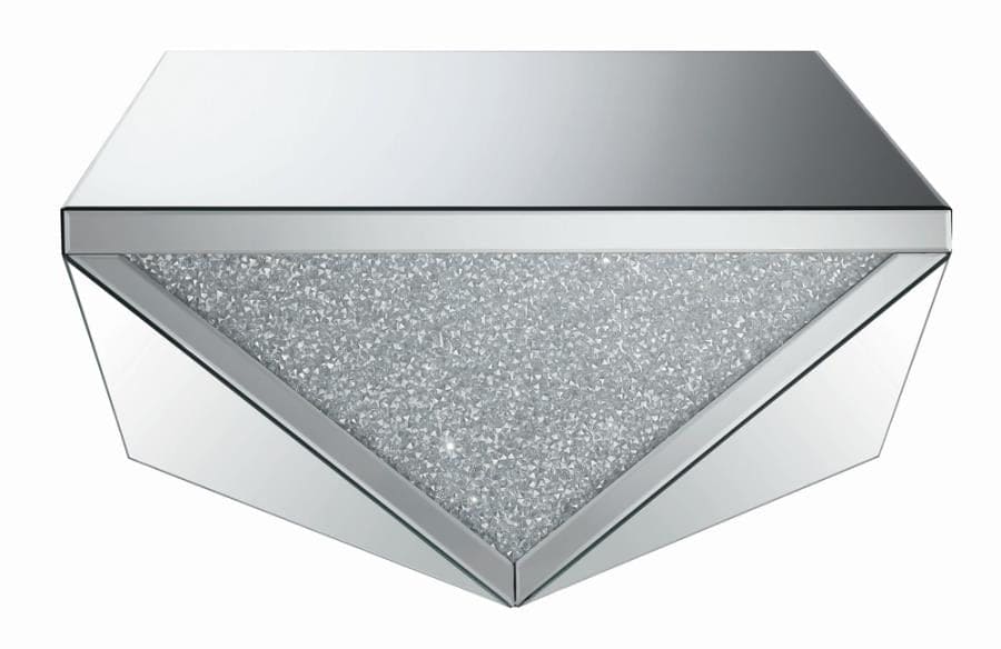 | Amplify the style of a modern living room. This stunning coffee table livens up your living space with a hint of shimmering sparkle. Its base is artfully crafted into a diamond shape with alternating triangles of glittery and silvery material. A shining, reflective surface tops it off with an extra touch of glam. With an air of luxurious opulence, this table is an exquisite choice for a contemporary home. |