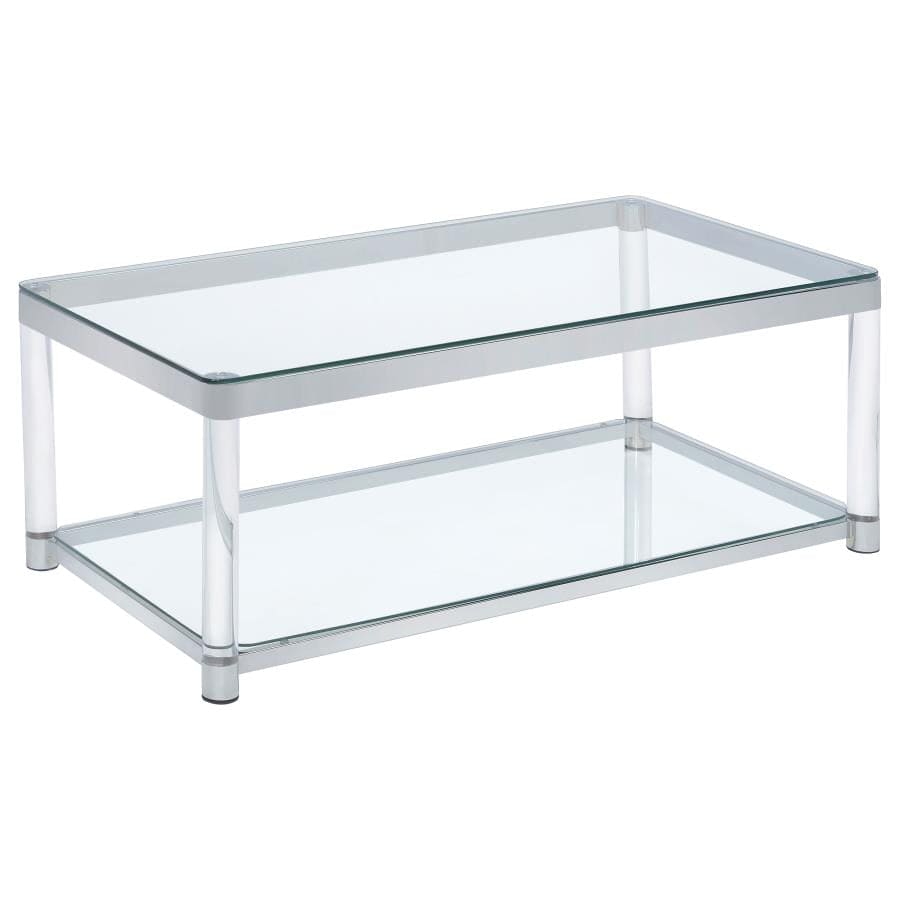 | Complete a stylish contemporary space with this glamorous coffee table. Create an elongated look with the sleek and rounded acrylic legs. The top and built-in storage shelf offer ample room for display, complete with chrome features. Go all-in on a chic minimalist theme with the bold metallic presence. Craft a stylish visual with the versatile display |