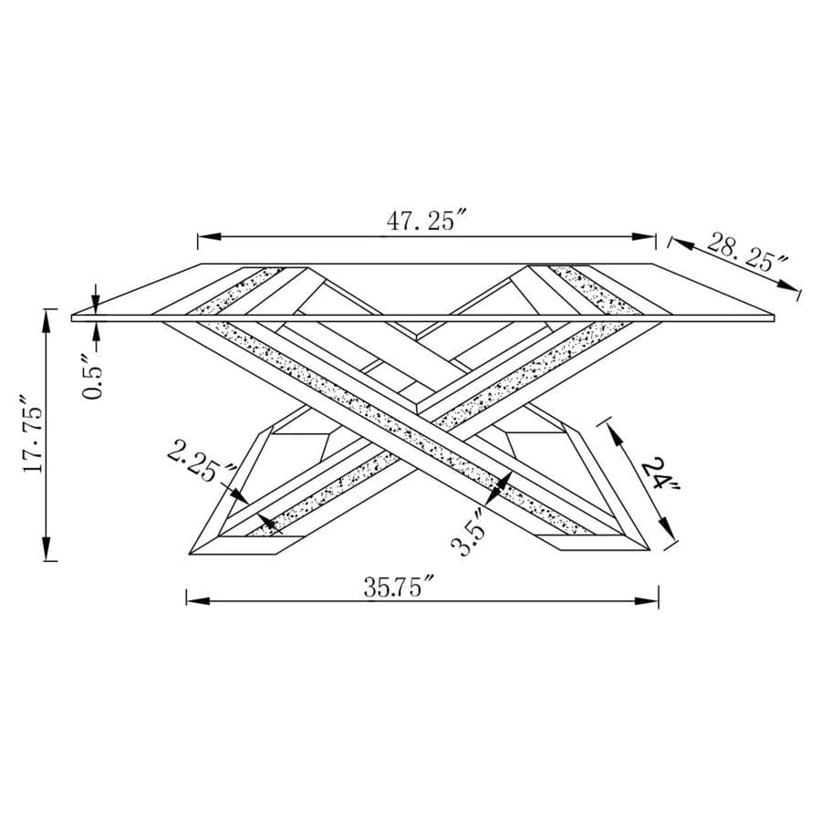 | Elevate your living room with this superb modern glam coffee table. An eye-catching X-shaped pedestal base lends a chic, sophisticated expression. The flared X-shaped base is covered in a glistening mirror trim and tile, reflecting your seating and surrounding color palette. A silver crushed acrylic center glimmers from within the borders, creating a luxe look. The clear glass top is spacious enough for showcasing centerpieces and placing refreshment trays and snacks when hosting visitors. |
