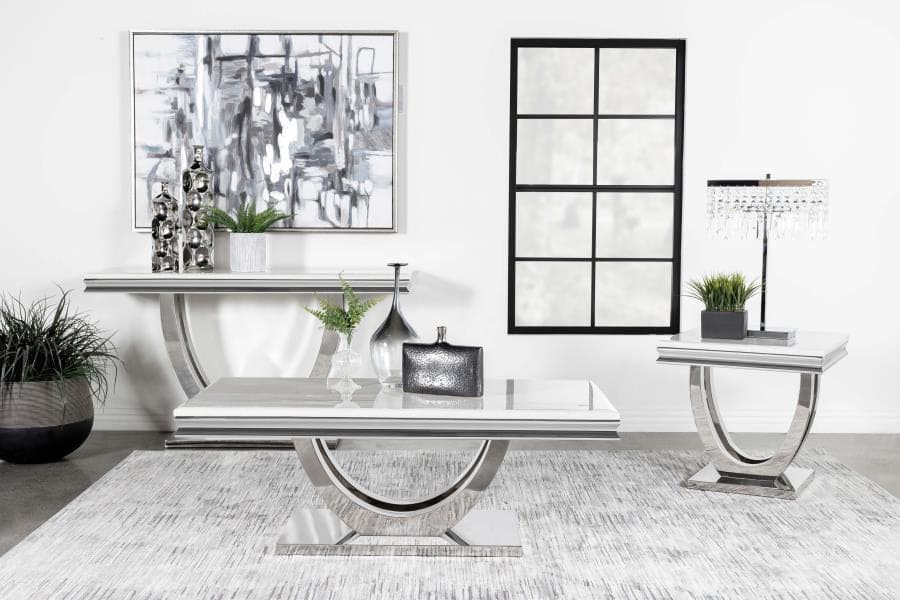 | * Spacious tabletop keeps lamps and essentials close by in a living room seating area * A faux marble design comes through in the white engineered stone tabletop, creating a clean contemporary flair * An open pedestal base with a flush bottom offers sweeping elegant curves * A gleaming polished chrome finish lends a luxurious modern surface * The tabletop features a charming beveled edge and contoured sides for a timeless touch |