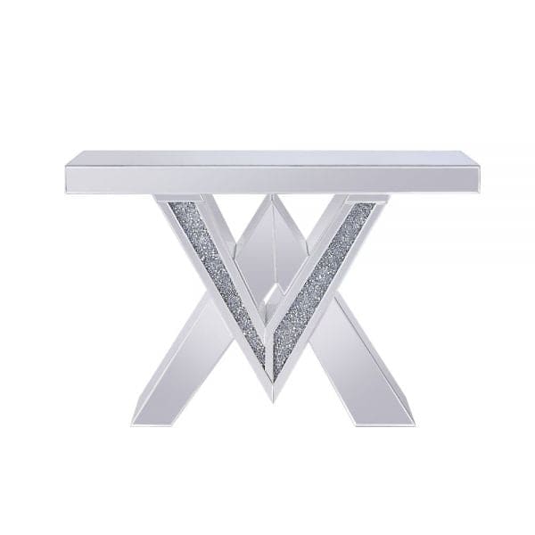 The Noralie Console Table will add a contemporary touch to any room in your home. With its clean lines, this brilliant rectangular occasional table showcases a distinctive style for an intriguing look. The table features a fully mirrored beveled table top and mirrored table base in a unique V-Shapedd design with a spectacular faux diamond inlay. This unique accent piece complements a wide range of Decor and its modern design is a useful addition to any living area.