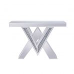 KD, Rectangular Console Table NO Storage CONSTRUCTION Mirrored Top (NO Apron) Mirrored "V" Shape Pedestal Base: Faux Diamonds Inlay & 4mm Clear Tempered Glass w/Beveled Edge, MDF