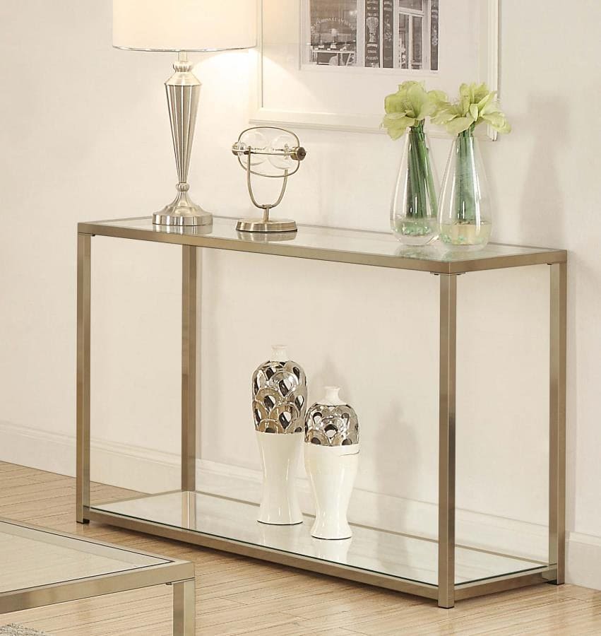 | This rectangular glass and chrome sofa table is an impressive addition to the home. A rectangular glass table top offers space for a decorative lamp and fresh flowers. A glass bottom shelf adds room for contemporary style vases or sculptures. The sturdy table frame is stylishly finished in chocolate chrome that's beautifully muted. It's chic enough to stand alone against the wall of the den or backed up against a contemporary sofa. |