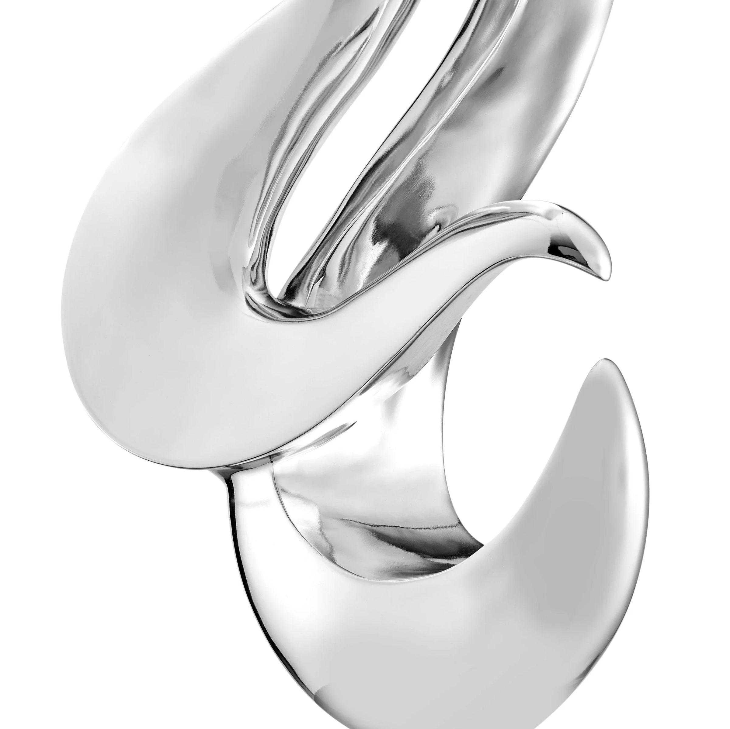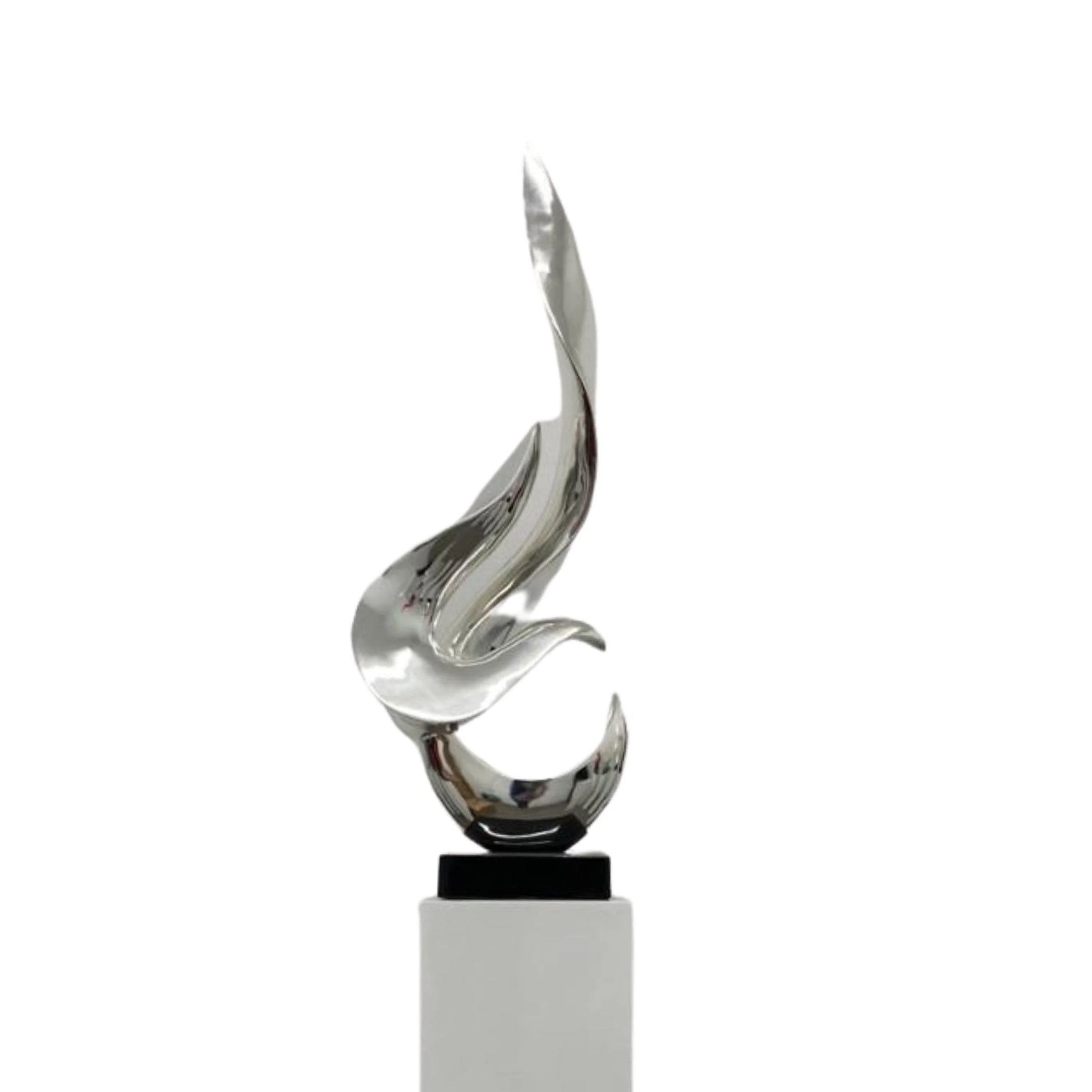 This modern art home decor floor sculpture will allow you to accentuate your style regardless of your chosen interior design. With its extravagant size, this sculpture resembles a museum-like exhibit. It has a lavish design and size that will leave your guests intrigued. It is a strong focal point and brings beautiful energy into any atmosphere. A wonderful Finesse Decor sculpture that will add a luxurious feel to any space. This gorgeous sculpture is made out of resin and has a solid, non-fading, gorgeous sleek chrome color that gives it a modern art look and includes a stand to showcase the sculpture as you would in a gallery.