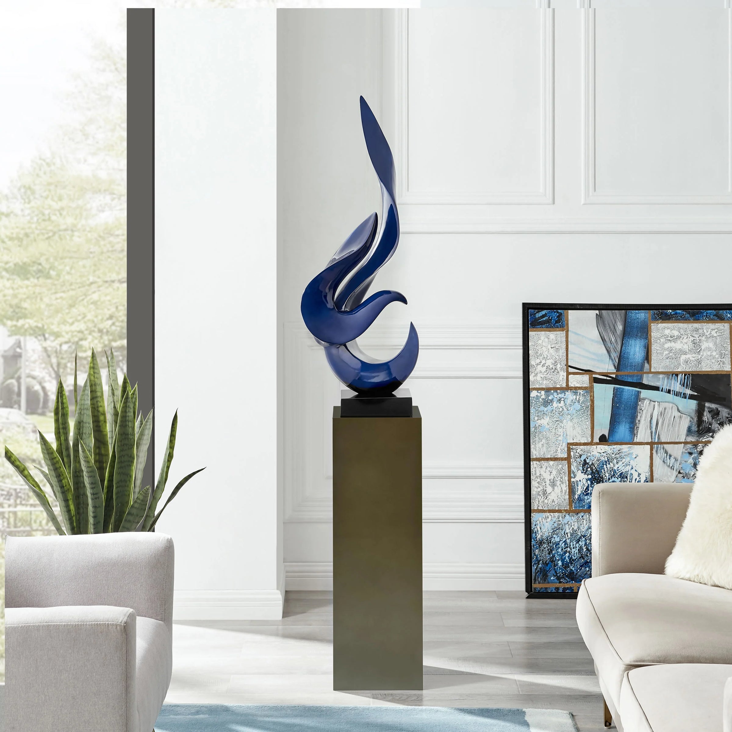 NAVY BLUE FLAME FLOOR SCULPTURE WITH GRAY STAND, 65" TALL