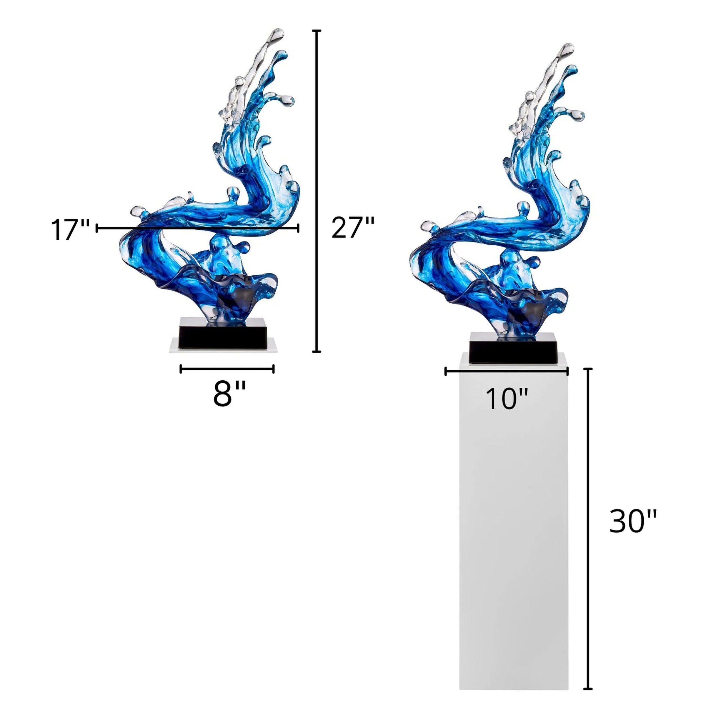 The Cortes Bay Wave Floor Sculpture is a decoration that has transparent colors mixed in with ocean blue tones set on a white stand. This floor sculpture comes in two pieces for easy transport and assembly. The two are attached together with a screw on a mechanism that is on both of the pieces. The top sculpture piece has a small 1.5" black base in which the hardware is located. Please note that these can not be used separately as the hardware will not allow the top part to stand on its own
