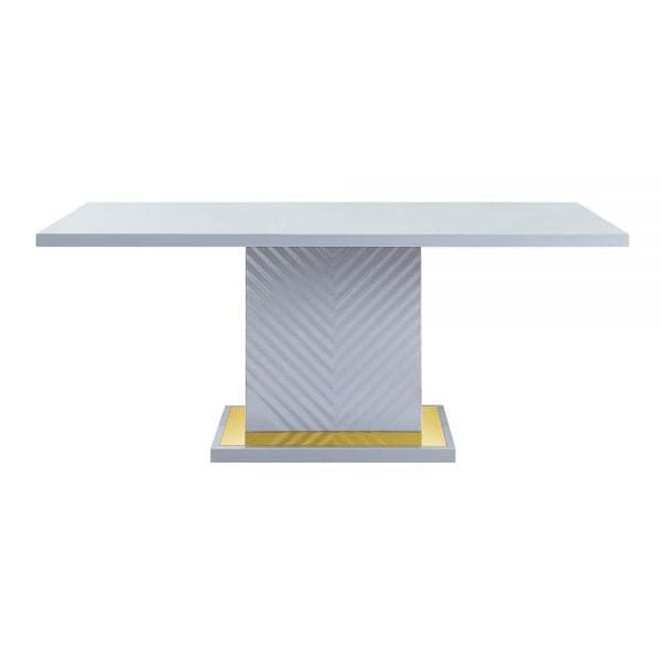 The sleek clean-lined table Gaines dining table offers subtle a hint of glam, the base offers a touch of gold to enhance the textured vertical lined pedestal. The gray high gloss finish reflects light and makes any dining space appear larger and grander. Ample enough to showcase an impressive spread for all your guests to enjoy.