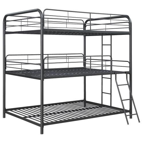 | Compact spaces and large families love this triple bunk bed. The modern design is enhanced with clean lines and durable heavy gauge steel construction. Finished in a gunmetal, this stylish triple bunk bed brings function and aesthetics to a youth's bedroom. Find two attached ladders available to access the middle and top bunks. With sturdy guardrails, you will feel peace of mind for the safety of your little ones. |