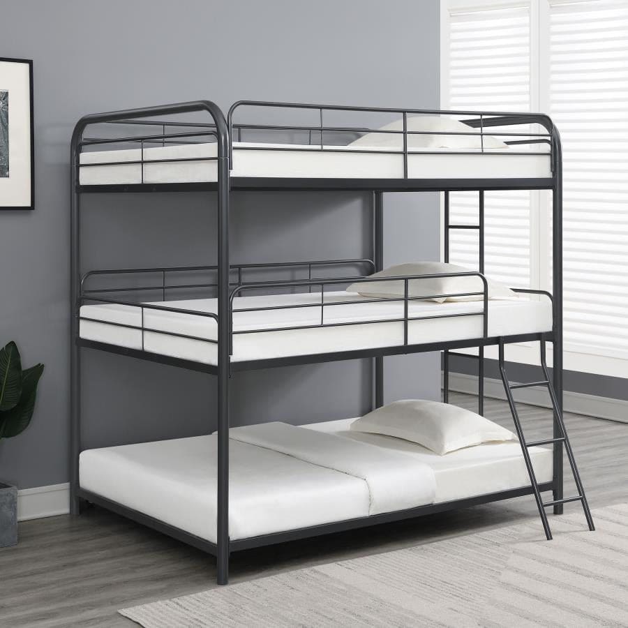 | Classically designed heavy gauge metal triple bunk bed in a gunmetal powder coated finish maximizes sleep space in any kids’ room or guestroom * Guardrails on middle and top bunk with attached ladders for safety * Available in triple twin, triple full, and full/twin/full configurations * Constructed with heavy gauge steel tubing * Durable steel slat kit included |