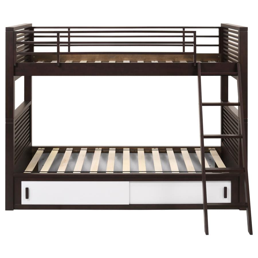 | Twin over twin bunk bed finished in java * Built-in storage unit with sliding doors in a white finish * The top bunk includes matching slatted guardrails and a built-in ladder for easy access * Constructed with solid rubberwood, plywood, MDF and okume veneer * Slat kit included |