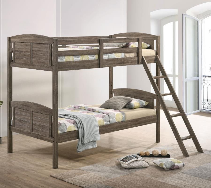 | A casual country vibe carries the space with this rustic bunk bed, perfect for compact bedrooms and shared sibling spaces. A weathered brown finish lends a neutral hue to transform a space into a serene, restful retreat. Along the top bunk are safety guardrails to keep younger ones secure as they sleep soundly through the night, complete with a built-in ladder for climbing up. The arched headboard and footboard offer grace and style, along with the plank paneling as the bottom bunk invites baskets, bins and more to organize personal items. Last but not least, this versatile bunk bed can be separated to create individual beds when siblings wish for their own space. |