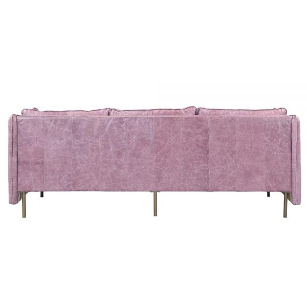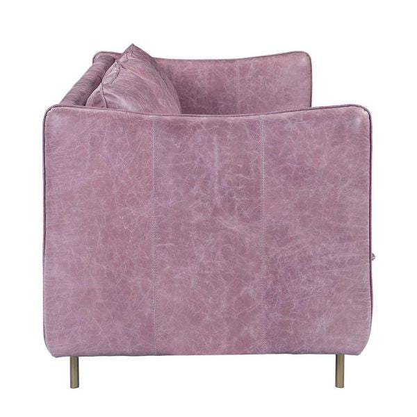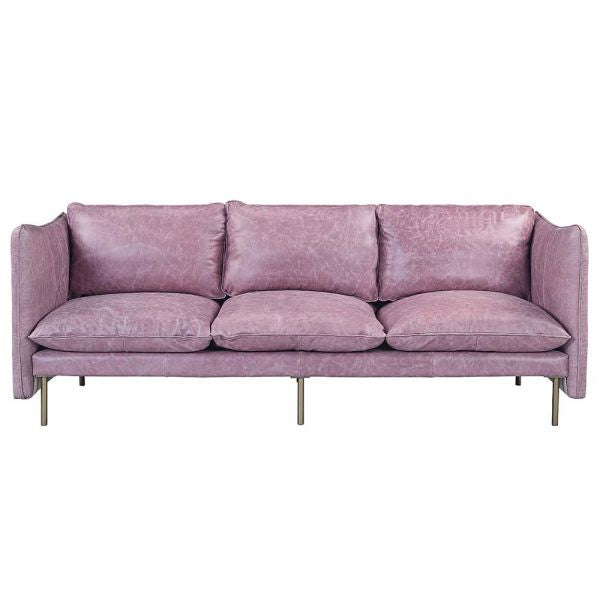 The Metis sofa is upholstered in buttery SOFT top grain leather in a Wisteria color that adds a touch of effortless romance to any room. The luxurious sofa is equipped with ultra-plush cushions and backrests. The metal brass legs add a hint of modern industrialism to the simplistic design. The inner wooden frame makes for a durable piece.
