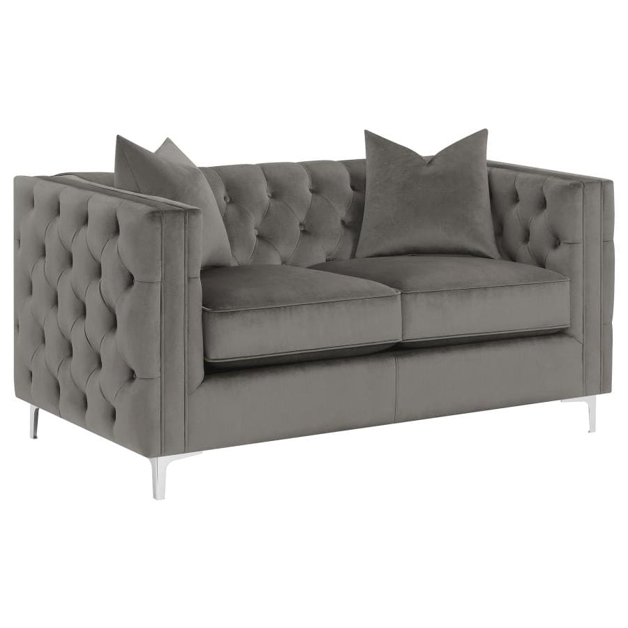 * Tuxedo style frames lend a timeless retro-inspired expression * A soft urban bronze velvet offers a plush look and feel and neutral color tone * Tight button-tufted backrests and arms create a supportive, welcoming embrace * Sturdy metal bracket legs offer a subtle lift and elevation over flooring * Matching throw pillows create extra comfort and tie the look together |