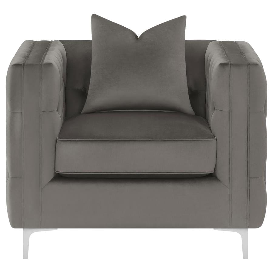 | Create a mid-century modern vibe to your living room with this modern glam seating collection, including a sofa, loveseat, and lounge chair. Beautiful Tuxedo-like frames upholstered in a soft urban bronze velvet lend an earthy color palette to your space along with plush seating. Button-tufted backrests and wide track arms elevate the overall look and present an inviting embrace. Under the welted box seat cushions, sturdy metal bracket legs in a shiny cool tone finish lift each frame, showcasing decorative rugs and more. Matching throw pillows complete the set, bringing softness to the corners. |
