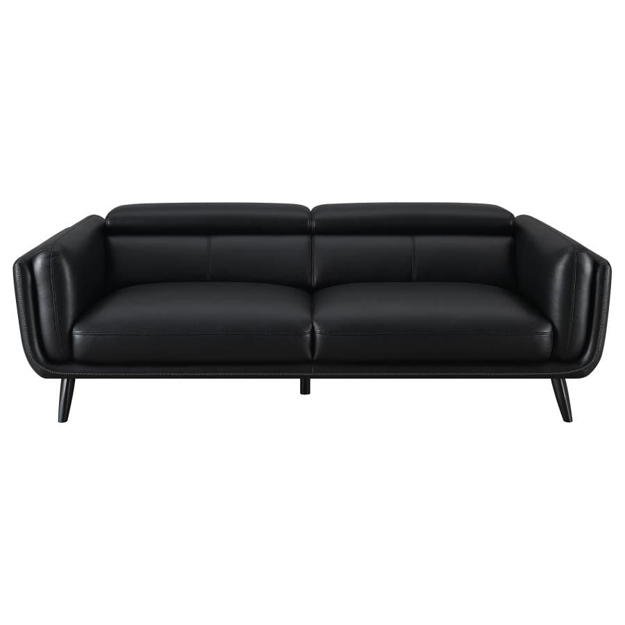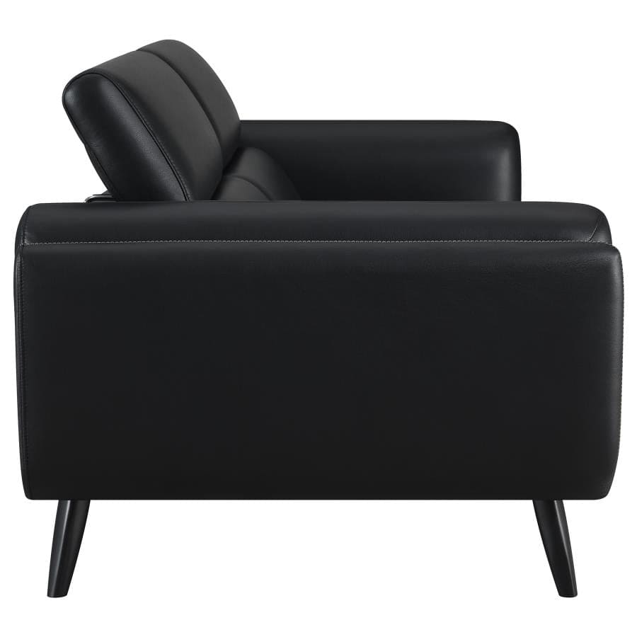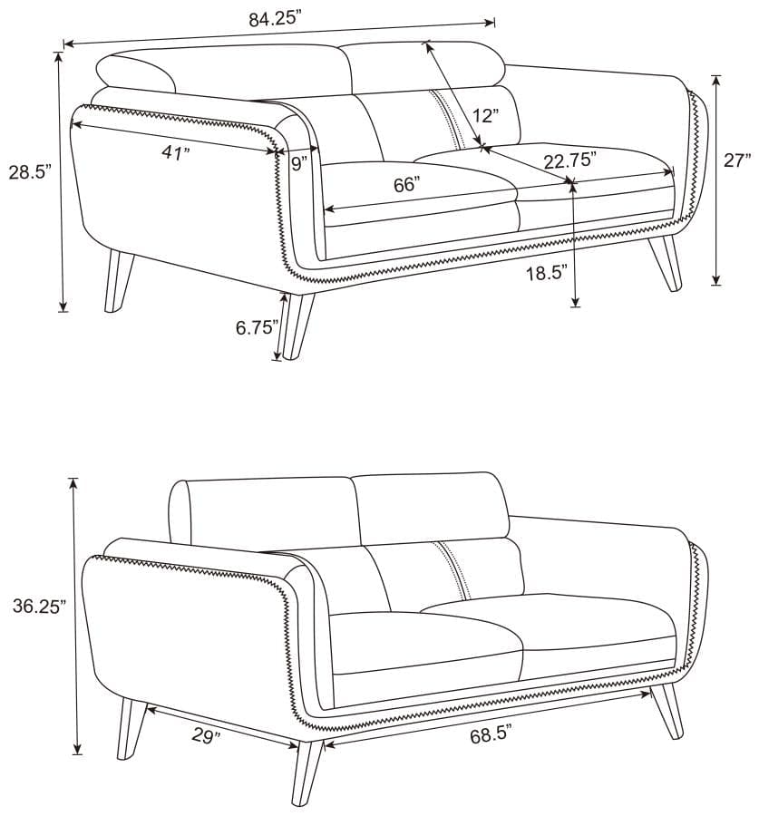 Complete your compact living room or entertainment area with this tuxedo-inspired contemporary sofa set. Sink into the plush attached seat cushions between padded double track shelter arms to relax at the end of a long day. Tall backs with lumbar support offer a comfy way to kick back too. Flared tapered legs in a dark brown finish peer out from beneath in a dramatic fashion, nodding to the mid-century modern frame design. Lastly, white cross-stitching and top stitching give the final touches and bit of contrast.