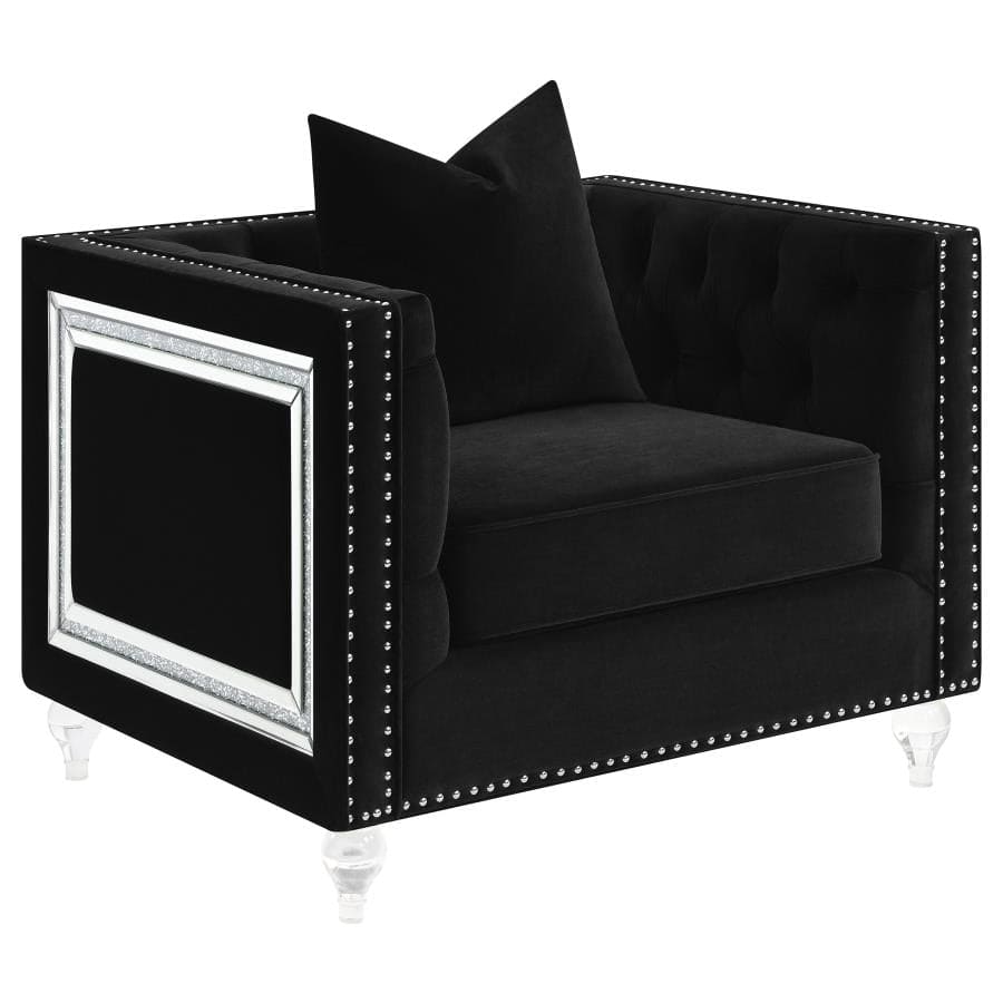 | A twist on the iconic tuxedo style design, this contemporary seating set offers a refinement to a modern style home. With a timeless button tufted backrest and arms, each upholstered furniture piece lends a sophisticated touch. Gleaming individually hammered nailhead trim stretches across the arm and down the bottom apron, offering a striking contrast to the soft and luxe black velvet fabric. Along each furniture pieces arm rest is an inset mitered mirror frame with sparkling acrylic crystal accents. Each piece also rests on turned clear acrylic legs, giving it a floating look. |