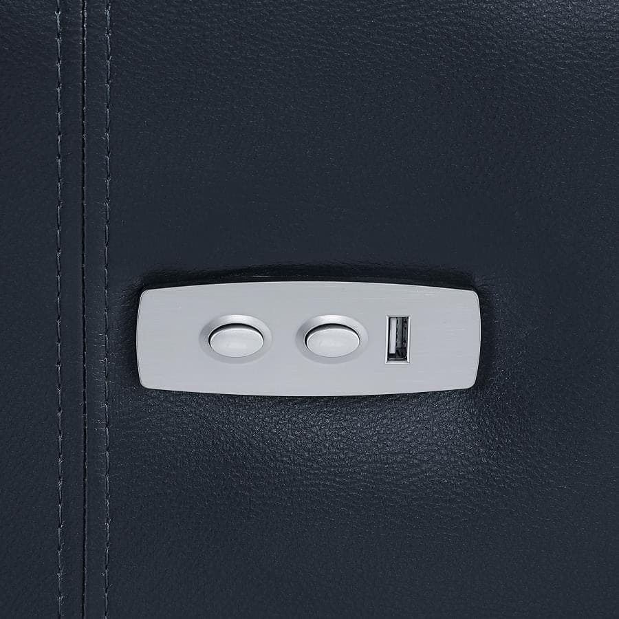 | High-leg power motion sofa collection upholstered in blue performance leatherette * Power reclining seats with extending footrest * Wall hugger mechanism optimizes available space * 2-over-2 sofa configuration * Control panels with built-in USB charging port * Cool gel memory foam offers superior temperature-regulating comfort * Certi-Pur certified foam * Polished aluminum legs |