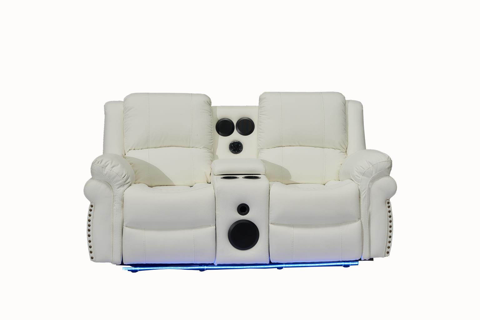 White leather recliner set with USB charging Bluetooth speakers LED lights and lots of comfort