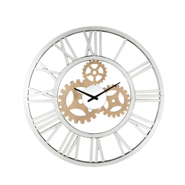 This Alicia round wall clock offers beveled mirrored panels that highlight its glamorous style. Features quartz mechanism, open back frame made with durable engineered wood. The clock face comes with a timeless roman numeral design that will naturally attract the eye.