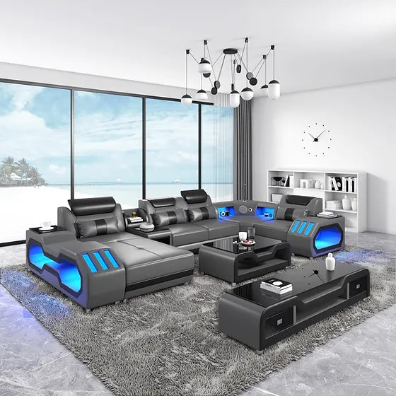 Crafted with high-density foam and a hardwood frame, and upholstered in leather to create a sleek and luxurious appearance. The modern sectionals feature a minimalist design with clean lines, making them an ideal addition to any contemporary living space. It also includes a console table, which is a must-have for every modern living room. The adjustable headrests not only add style but also provide comfort. The sectional also offers two storage spaces, perfect for storing books or magazines. The side of the leather sectional is illuminated by an changing color LED light, adding a touch of ambiance. Bluetooth speakers are integrated intothe corner wedge of the sectional, allowing you to enjoy your music comfortably using your phone. The unique geometric design on the sides of the couch quickly captures the attention of visitors. With its generous size, this sectional provides ample space for family and friends to socialize in comfort.