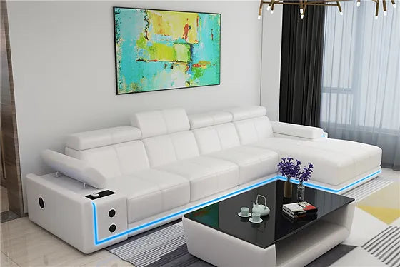 The sectional boasts innovative features, including a built-in Bluetooth speaker discreetly tucked under the armrest for immersive audio experiences. The adjustable headrests offer personalized comfort, while the convenient wireless charging capability ensures your devices stay powered. Experience modern luxury and cutting-edge technology in one sophisticated package.