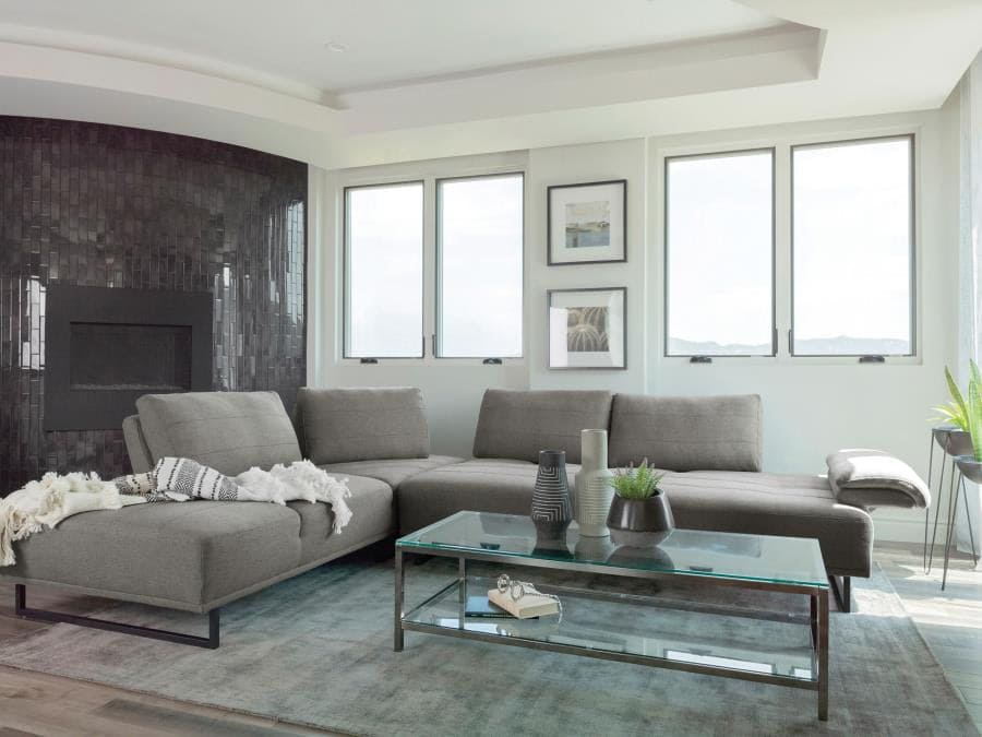 | Add modern stylishness to your space with this magnificent contemporary sectional sofa. It is exceptionally upholstered in an elegant taupe woven fabric that's soft to the touch. The powder coated black base features U-frame legs for sturdiness. One end has an open chaise-like design, while the opposite has an extension pillow top arm that can be used as a headrest when lounging. An added feature is the individual self-adjusting back rests, which allow for shortening and expanding seat depth. |