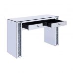 The Noralie Vanity Desk will give any room a touch of glamour. This contemporary desk is fully mirrored with a stunning mirror top and a faux diamond inlay on each leg of its sled base. Use this unique vanity desk for make-up application, jewelry, or as a small writing desk. Two large drawers provide ample and convenient storage for makeup brushes, jewelry, and more.